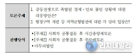 '공직선거법'제82조의3에 따라 개최하는 이번 토론회는 총 5개 정당이 참여하여 ▲ ‘중동전쟁으로 촉발된 경제·안보 불안 상황에 대한 대응방안’, ▲ ‘행정구역 개편 등 지역균형발전에 대한 각 당의 입장’을 주제로 토론할 예정이다.