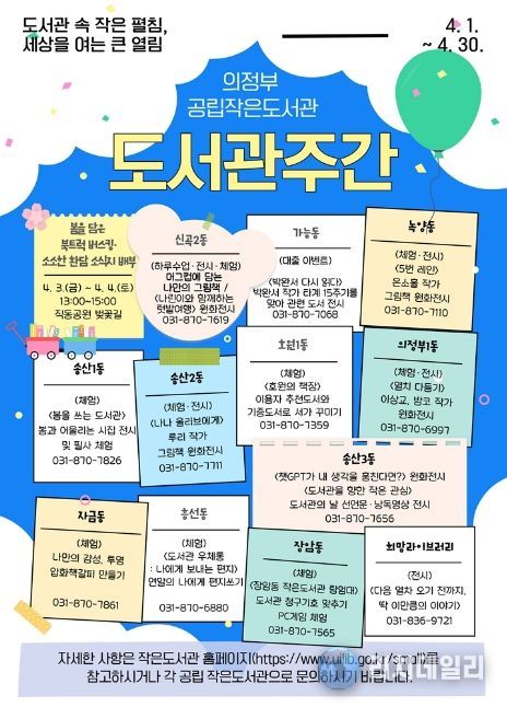 의정부시 공립 작은도서관에서는 ‘도서관 속 작은 펼침, 세상을 여는 큰 열림’을 주제로 머그컵에 담는 나만의 그림책, 원화 전시, 독서 이벤트 등 다양한 독서문화 프로그램을 마련해 시민들에게 풍성한 독서 경험을 제공할 계획이다.