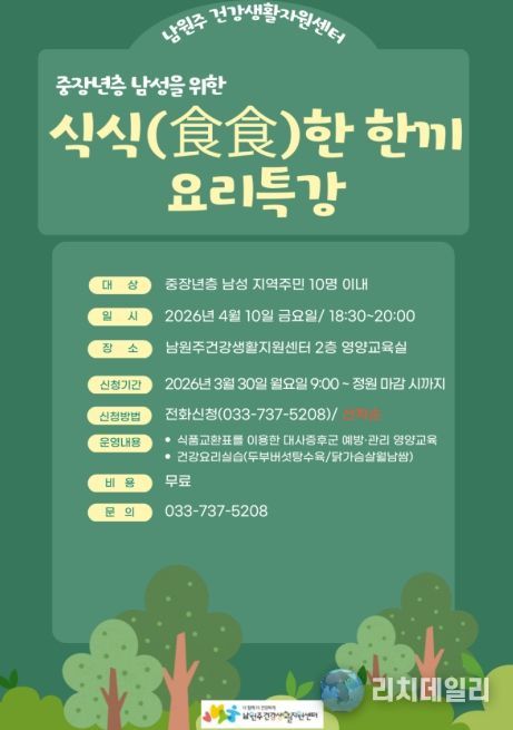 리치데일리 김상현 기자 | 남원주건강생활지원센터는 영양 교육 및 건강 요리 실습 기회가 적은 중장년 남성을 위한 ‘식식(食食)한 한끼’ 프로그램 참여자를 모집한다.