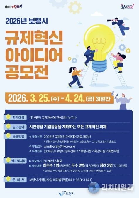 리치데일리 김상현 기자 | 보령시는 3월 25일부터 4월 24일까지 31일간 ‘2026년 보령시 규제혁신 아이디어 공모전’을 개최한다고 밝혔다.