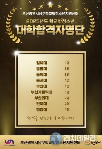리치데일리 김상현 기자 | 부산 남구 학교밖청소년지원센터는 센터 소속 학교 밖 청소년 15명이 부산대학교, 인제대학교, 동의대학교, 청강대학교 등의 다양한 대학에 합격하는 성과를 거뒀다고 밝혔다.