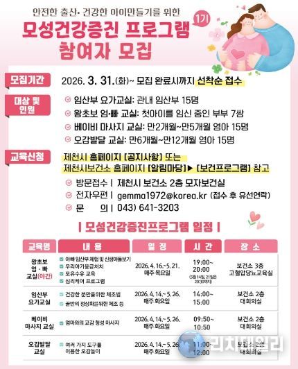 리치데일리 김상현 기자 | 제천시 보건소는 오는 4월 중순부터 운영하는 ‘모성건강증진 프로그램’ 1기 참여자를 31일부터 선착순으로 모집한다.