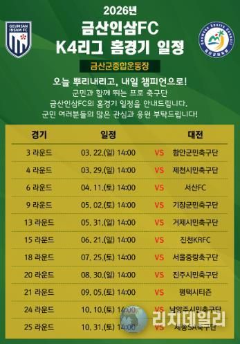 리치데일리 김상현 기자 | 금산인삼에프씨는(FC)는 2026 시즌 케이(K)4리그 안방 사수를 위한 홈경기 일정을 전격 안내에 나섰다.