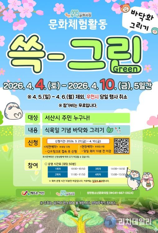 리치데일리 김상현 기자 | 성연청소년문화의집은 오는 4월 4일부터 10일까지 식목일 기념 문화체험활동인 ‘쓱-그린(Green)’ 바닥화 그리기 이벤트를 개최한다고 밝혔다.
