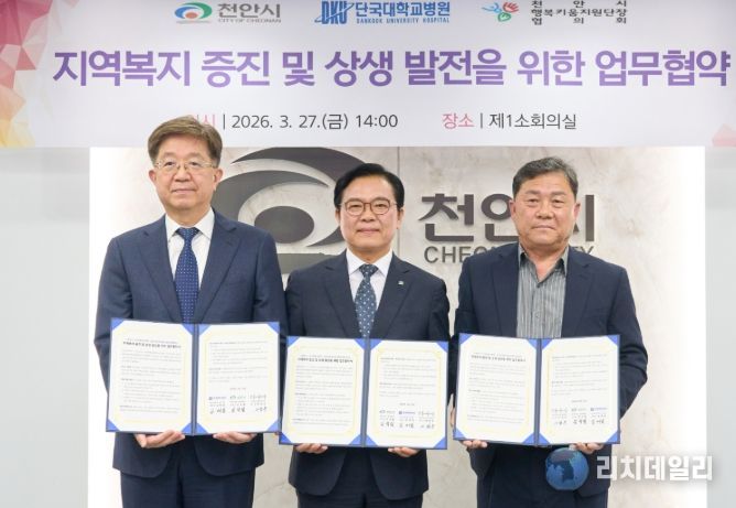 리치데일리 김상현 기자 | 천안시는 27일 시청 제1소회의실에서 단국대학교병원, 천안시행복키움지원단장 협의회와 지역복지 증진 및 상생 발전을 위한 업무협약을 체결했다.