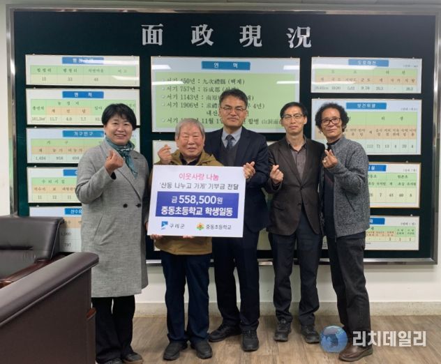 리치데일리 김상현 기자 | 구례군 산동면은 지난 25일, 산동면사무소에서 중동초등학교 학생들이 마련한 성금 55만8,500원을 산동면지역사회보장협의체(민간위원장 유영만)에 전달했다고 밝혔다.