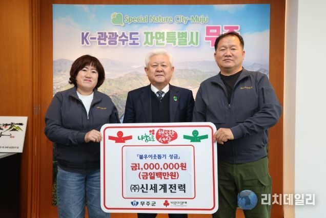 리치데일리 김상현 기자 | ㈜신세계전력은 지난 23일 무주군에 이웃돕기 성금 1백만 원을 기부했다. 무주읍에 위치한 ㈜신세계전력은 전기공사업을 하는 기업으로 평소 생활개선회를 비롯한 의용소방대 활동 등 지역사회를 위한 활동에서 솔선수범하고 있다.