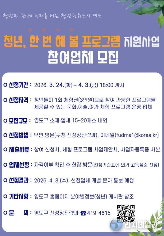 리치데일리 김상현 기자 | 부산 영도구는 청년들에게 다채로운 문화 향유의 기회를 제공하고 지역 청년 문화를 활성화하기 위해 '2026년 청년, 한 번 해 봄 프로그램 지원 사업'을 추진한다고 밝혔다.