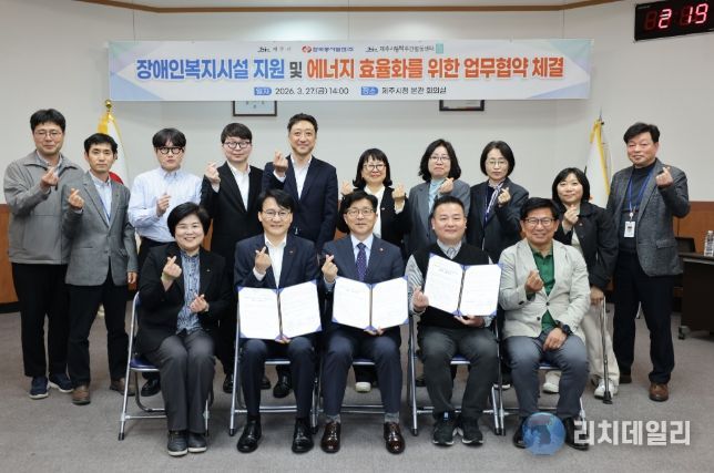 리치데일리 김상현 기자 | 제주시는 3월 27일 시청 본관 회의실에서 한국동서발전, 제주시동백주간활동센터와 함께 ‘장애인복지시설 지원 및 에너지 효율화를 위한 업무협약’을 체결했다.