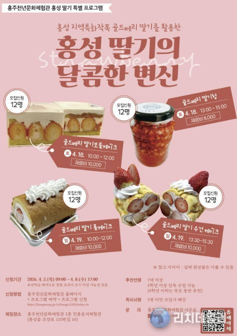 리치데일리 김상현 기자 | 홍성군 홍주천년문화체험관은 오는 4월 18일부터 19일까지 이틀간, 지역특화작목인 골드베리 딸기를 활용한 특별 프로그램을 운영한다고 밝혔다.