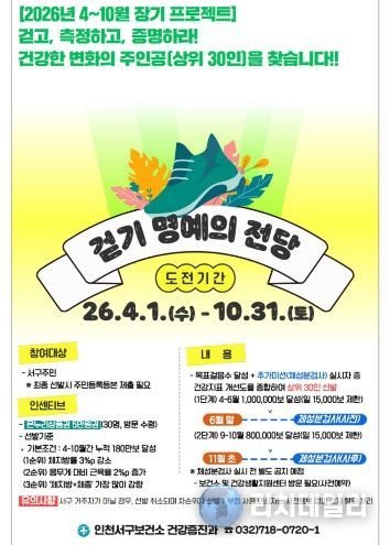 리치데일리 김상현 기자 | 인천 서구는 지역주민의 일상 속 걷기 실천 및 신체활동 장려를 위해 ‘걷기 명예의 전당 챌린지’를 오는 4월부터 10월까지 운영한다고 밝혔다.