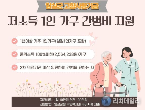 리치데일리 김상현 기자 | 임실군은 고향을 사랑하는 마음으로 후원한 ‘고향사랑기금’을 활용해 ‘저소득 1인 가구의 간병비 지원 사업’을 4월부터 본격 시행하여 고독사 예방과 사회적 안전망 강화에 앞장설 계획이다.