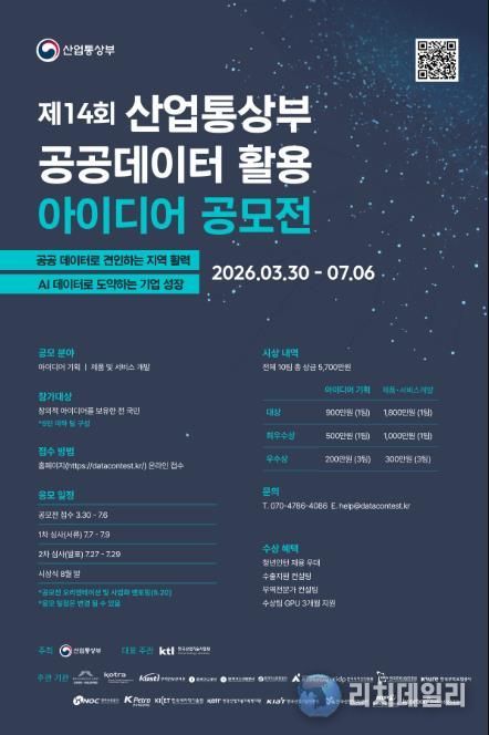 리치데일리 김상현 기자 | 산업통상부는 산업기술시험원 등 산하 공공기관과 함께 3월 30일∼7월 6일까지 '제14회 공공데이터 활용 아이디어 공모전'을 개최한다.