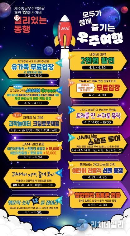 리치데일리 김상현 기자 | 제주국제자유도시개발센터)에서 운영하는 제주항공우주박물관은 개관 12주년을 기념하여 4월 1일부터 4월 30일까지 한달간‘일리(12) 있는 동행, 모두가 함께 즐기는 우주여행’을 주제로 특별 프로모션을 실시한다고 밝혔다.