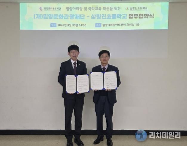 리치데일리 김상현 기자 | 밀양문화관광재단은 30일 밀양아리랑아트센터에서 삼랑진초등학교와 밀양아리랑 전승 기반 강화 및 국악 교육 진흥을 위한 업무협약을 체결했다.