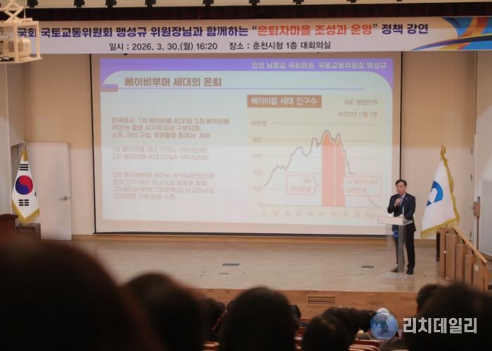 맹성규 국토위원장은 30일 춘천시청 대회의실에서 ‘은퇴자마을 조성과 운영’을 주제로 정책 강연을 개최했다. 맹성규 위원장은 은퇴자마을 조성 및 운영에 관한 특별법을 대표발의했으며 지난 17일 해당 법안이 공포됐다. 이날 강연에는 은퇴자마을 특별법을 공동 발의하며 법안 통과를 함께 이끈 허영 국회의원도 참석했다.