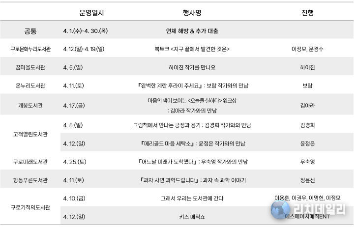 이와 함께 구로기적의도서관에서는 4월 10일 ‘그래서 우리는 도서관에 간다’의 이용훈·이권우·이명헌·이정모 작가가 참여하는 강연을, 항동푸른도서관에서는 4월 11일 ‘과자 사면 과학드립니다’의 정윤선 작가 초청 강연을 진행한다.