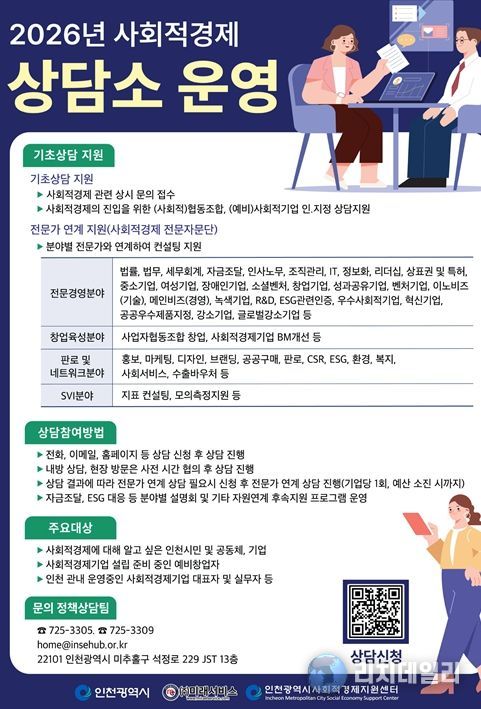 리치데일리 김상현 기자 | 인천광역시는 지역 내 사회적경제 기업의 지속 가능한 성장과 자생력 강화를 위해 ‘2026년 사회적경제 상담소’를 연중 상시 운영한다고 밝혔다.