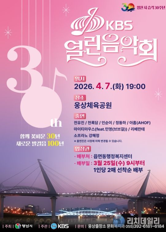 리치데일리 김상현 기자 | 양산시가 시 승격 30주년을 기념하고 ‘2026 양산방문의 해’를 널리 알리기 위해 4월 7일(화) 저녁 7시 웅상체육공원 축구장에서‘KBS 열린음악회’를 개최한다고 밝혔다.