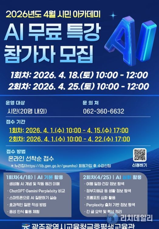 오는 4월 18일과 25일 진행되는 ‘AI 활용’ 강좌의 수강 신청은 4월 1일 오전 10시부터 금호평생교육관 누리집에서 하면 된다.