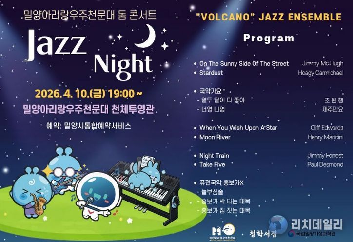 리치데일리 김상현 기자 | 밀양문화관광재단은 오는 4월 10일 밀양아리랑우주천문대 천체투영관에서 우주와 음악이 결합한 특별한 문화 행사 ‘재즈 나이트(Jazz Night)’를 개최한다.