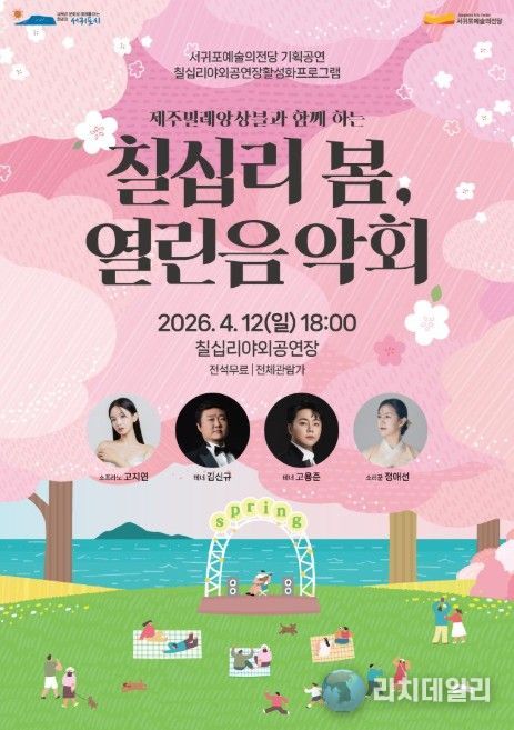 리치데일리 김상현 기자 | 서귀포예술의전당은 칠십리야외공연장 활성화 프로그램의 일환으로, 4월 12일 오후 6시 칠십리야외공연장에서 제주빌레앙상블과 함께하는 ‘칠십리 봄, 열린음악회’를 개최한다.