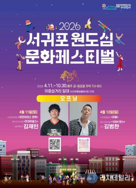 리치데일리 김상현 기자 | 서귀포시는 올해 4월 11일부터 10월 30일까지 매주 금·토·일요일 저녁 7시에 이중섭로 일대에서 대표 상설 야간 문화행사인 `2026 서귀포 원도심 문화페스티벌'을 개최하여, 지역 예술인 및 청소년 동아리 공연 등 다채로운 볼거리를 선보일 예정이다.