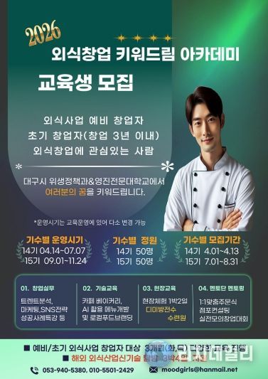 노권율 대구광역시 위생정책과장은 “이번 외식창업 ‘키워드림’ 아카데미가 침체된 지역경제에 새로운 활력을 불어넣길 기대한다”며 “내실 있는 교육과정 운영을 통해 실패를 최소화하는 창업 생태계를 조성하고, 대구 외식업계가 지속 가능한 성장을 이어갈 수 있도록 적극 지원하겠다”고 말했다.