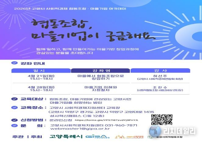 리치데일리 김상현 기자 | 고양산업진흥원 고양시사회적경제지원센터가 ‘2026년 고양시 사회적경제 협동조합·마을기업 아카데미’수강생을 오는 4월 17일까지‘모집한다.