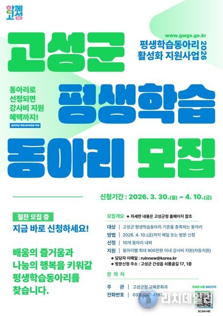 리치데일리 김상현 기자 | 평화경제 거점 도시 강원 고성군은 군민의 자발적인 학습공동체 활성화와 평생학습 문화 확산을 위해 '2026년 고성군 평생학습동아리 활성화 지원사업'을 추진하고, 참여 동아리를 모집한다고 밝혔다.