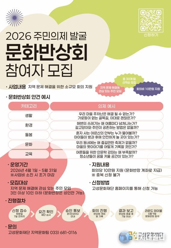 리치데일리 김상현 기자 | 고성문화재단은 주민 스스로 지역의 문제를 진단하고 대안을 모색하는 2026 주민의제 발굴 '문화반상회' 참여 모임을 오는 4월 1일 수요일부터 5월 31일 일요일까지 모집한다.