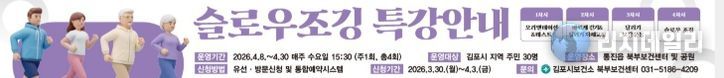 ‘슬로 조깅’은 일반 달리기보다 속도를 낮춰 누구나 부담 없이 참여할 수 있는 운동으로, 특히 고령자나 운동 초보자도 안전하게 실천할 수 있는 것이 특징이다. 이번 프로그램은 만 60세 이상 어르신을 우선 대상으로 하며, 김포시 거주 주민이면 누구나 신청할 수 있다.