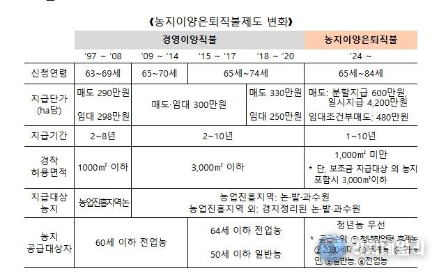 농식품부 강동윤 농촌소득에너지정책국장은 “이번 제도 개선은 고령 농업인의 현실적인 영농 여건을 반영한 것”이라며, “앞으로도 안정적인 노후소득 보장과 함께 원활한 영농 세대교체가 이루어질 수 있도록 제도를 지속적으로 보완해 나가겠다”고 밝혔다.