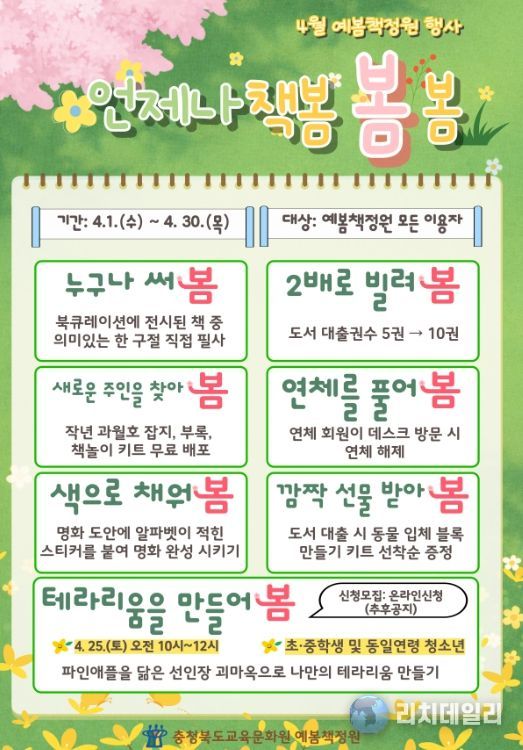 리치데일리 김상현 기자 | 충청북도교육청 직속기관 교육문화원은 예봄책정원에서 충북 도민들이 책과 함께 따뜻한 봄을 만끽할 수 있는 독서행사 '언제나 책봄‧봄‧봄'을 4월 한 달간 운영한다.