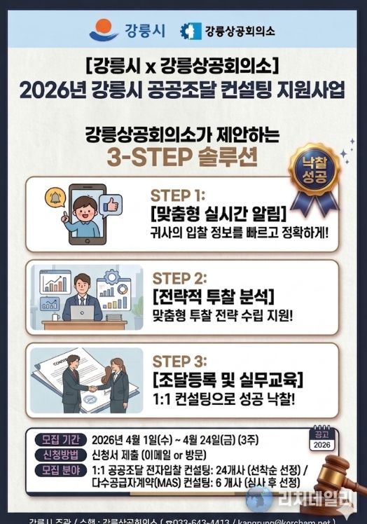리치데일리 김상현 기자 | 강릉시는 관내 중소기업의 판로 개척과 경쟁력 강화를 위해 ‘2026년 공공조달 컨설팅 지원사업’을 추진하고, 1일부터 참여 희망 기업을 모집한다.