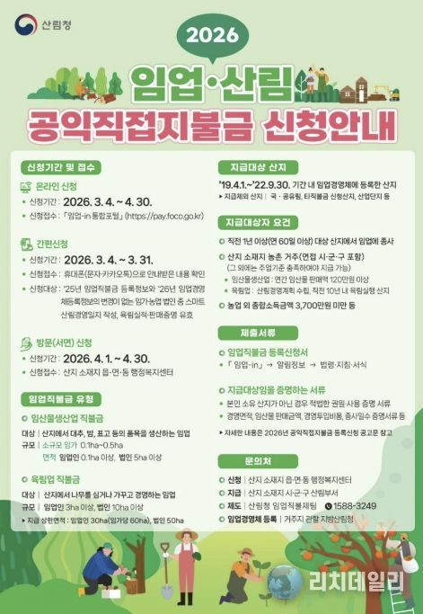 리치데일리 김상현 기자 | 괴산군은 2026년 임업‧산림 공익직접지불금 방문 신청접수를 오는 30일까지 실시한다고 1일 밝혔다.