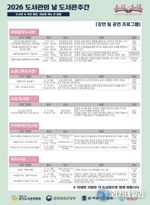 도서관의 날과 도서관주간은 도서관의 사회적 가치를 널리 알리고 이용을 활성화하기 위해 지정된 기간으로, 마포구립도서관은 강연과 공연, 체험 등 다양한 행사를 마련해 일상에서 자연스럽게 독서를 접할 수 있게 했다.