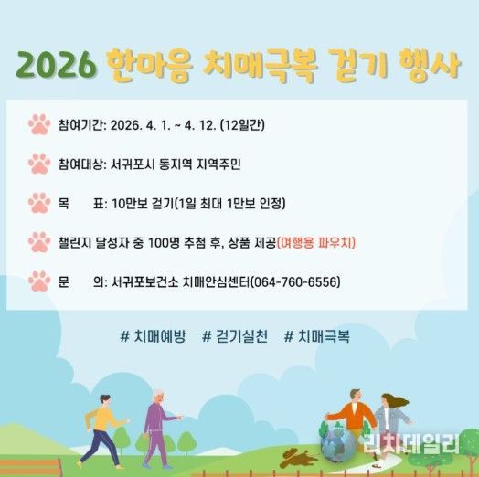 서귀포시 동지역 주민이면 누구나 참여할 수 있으며, 참여를 희망하는 주민은 휴대전화에 워크온 앱을 설치한 후 서귀포시 공식 커뮤니티 ‘2026 한마음 치매극복 걷기행사’ 챌린지를 선택해 참여하면 된다.