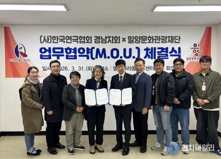 리치데일리 김상현 기자 | 밀양문화관광재단은 지난 3월 31일 밀양아리랑아트센터 회의실에서 한국연극협회 경남지회와 지역 연극 예술의 저변 확대와 문화 발전을 위한 업무협약(MOU)을 체결했다.