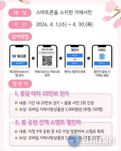 리치데일리 김상현 기자 | 거제시보건소가 완연한 봄을 맞아 시민들의 건강한 생활 습관 형성을 위해 오는 4월 1일부터 한 달간 모바일 걷기 앱 ‘워크온(WalkOn)’을 활용한 ‘거제사랑 걷기 챌린지’를 운영한다.