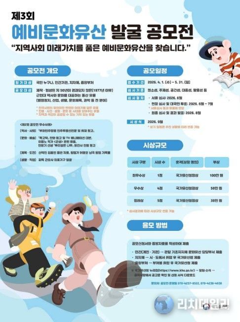리치데일리 김상현 기자 | 국가유산청은 4월 1일부터 5월 31일까지 근현대 한국 사회의 역사와 문화를 대표하고 국민이 공감할 수 있는 미래 문화자원을 발굴하기 위해 '제3회 예비문화유산 발굴 공모전'을 개최한다.