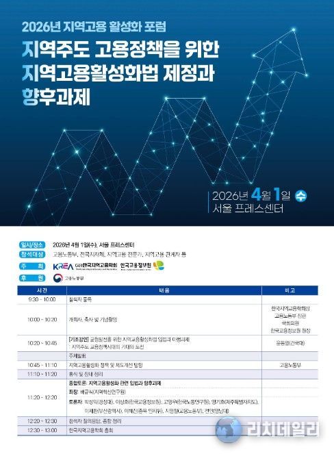 리치데일리 김상현 기자 | 고용노동부 한국고용정보원은 사단법인 한국지역고용학회와 공동으로 4월 1일 서울 프레스센터에서'2026년 지역고용 활성화 포럼'을 개최한다. 이번 포럼은 ‘지역 주도 고용정책을 위한 지역고용활성화법 제정과 향후 과제’를 주제로, 지역 주도 고용정책 실현을 위한 입법의 필요성을 공유하고 실효성 있는 정책과제를 논의하기 위해 마련됐다.