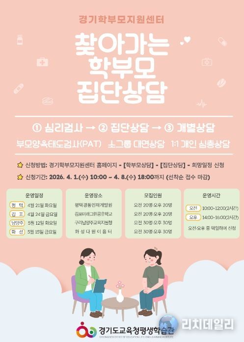 리치데일리 김상현 기자 | 경기도교육청평생학습관 경기학부모지원센터가 자녀양육 과정에서 학부모가 경험하는 어려움과 고민을 함께 나누고 공감할 수 있도록 녪년 찾아가는 학부모 집단상담 프로그램’을 운영한다.