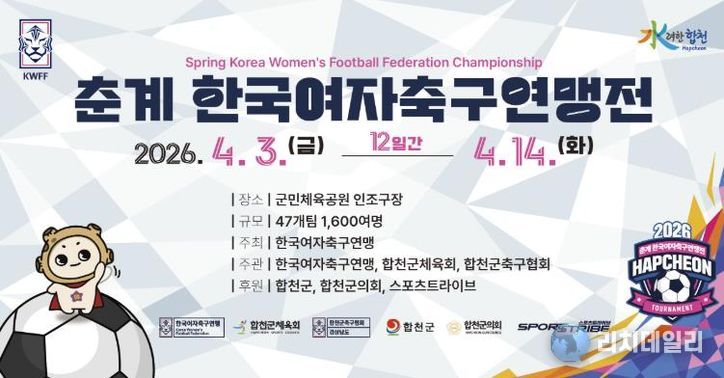 리치데일리 김상현 기자 | 합천군은 대한민국 여자축구의 미래를 이끌 선수들이 한자리에 모이는 '2026년 춘계 한국여자축구연맹전'이 4월 3일부터 14일까지 12일간 군민체육공원 인조구장에서 개최된다고 밝혔다.