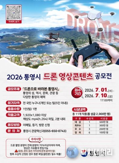 리치데일리 김상현 기자 | 통영시는 통영시의 아름다운 자연경관과 다채로운 관광자원을 널리 알리고 국민 참여형 콘텐츠 제작 활성화를 위해‘2026 통영시 드론 영상콘텐츠 공모전’을 진행하고 있다.