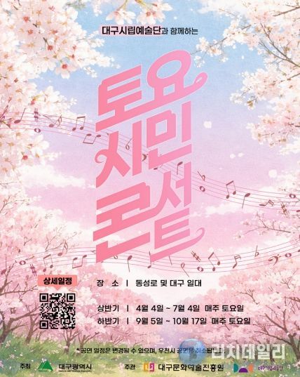 ‘토요시민콘서트’는 대구시립교향악단·시립합창단·시립국악단·시립무용단·시립극단·시립소년소녀합창단 등 6개 시립예술단체가 참여하는 대구 대표 야외공연 프로그램으로, 2024년부터 시민들에게 고품격 공연을 선보이며 호응을 얻고 있다.