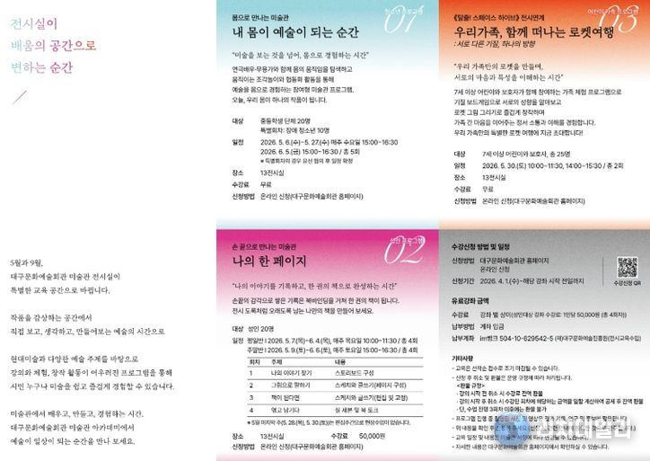 김희철 대구문화예술회관 관장은 “뮤지엄 아카데미는 작품을 감상하는 공간을 넘어, 직접 경험하고 참여하는 배움의 공간으로 확장하는 프로그램”이라며 “시민들이 일상 속에서 예술을 더욱 가까이 느끼는 계기가 되기를 기대한다”고 말했다.