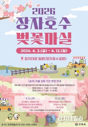 리치데일리 김상현 기자 | 구리시는 ‘2026 장자호수 벚꽃마실’ 축제 일정을 벚꽃 개화 시기에 맞춰 당초 4월 11일에서 4월 3일로 앞당겨 시작한다고 밝혔다.