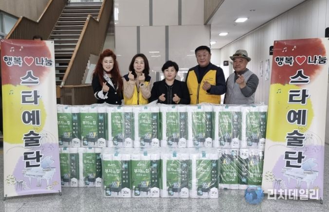 리치데일리 김상현 기자 | 행복나눔 문화예술봉사회와 스타예술단이 지난 1일 온양6동 행복키움추진단에 휴지 40세트를 전달하며 나눔을 실천했다. ㈜이수에코테크와 조양산업도 뜻을 함께했다.