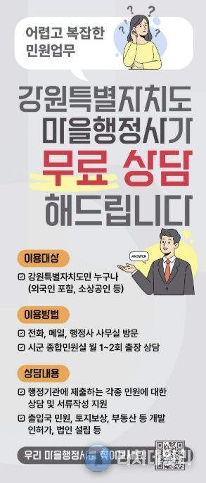 이와 함께 홍천군은 대면 소통을 강화하기 위해 ‘출장 상담소’를 별도로 운영한다. 출장 상담은 매월 둘째 주와 넷째 주 수요일 오후 1시부터 4시까지 홍천군청 민원실에서 열리며, 당일 현장 접수순으로 상담을 진행한다 .출장 상담은 시군 마을 행정사로 위촉된 행정사가 돌아가며 1명씩 상담을 진행할 예정이다.